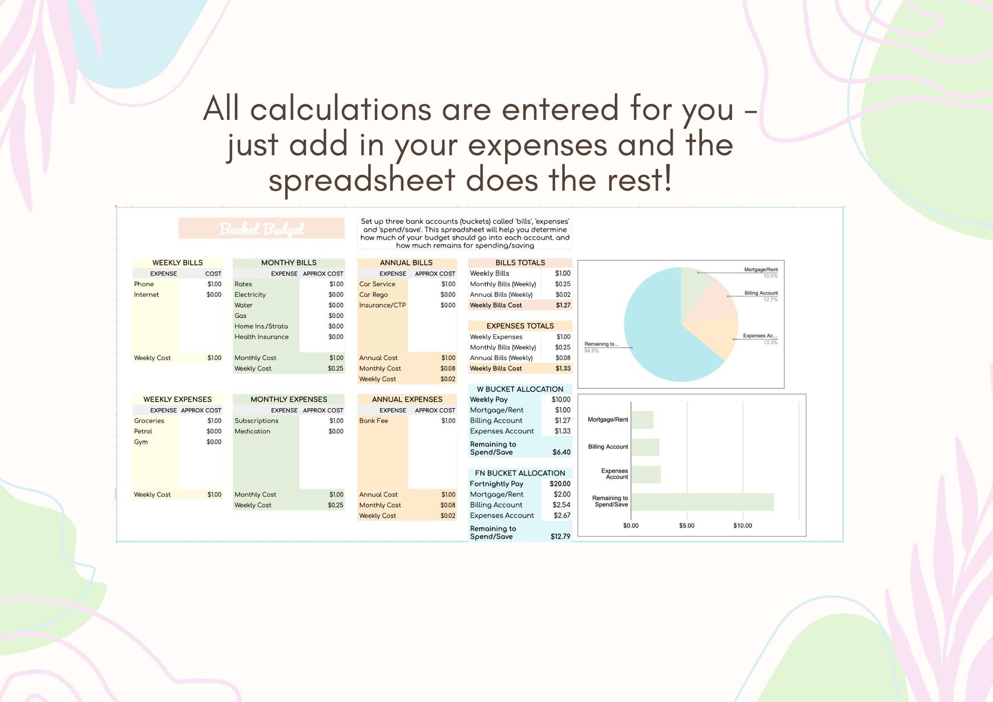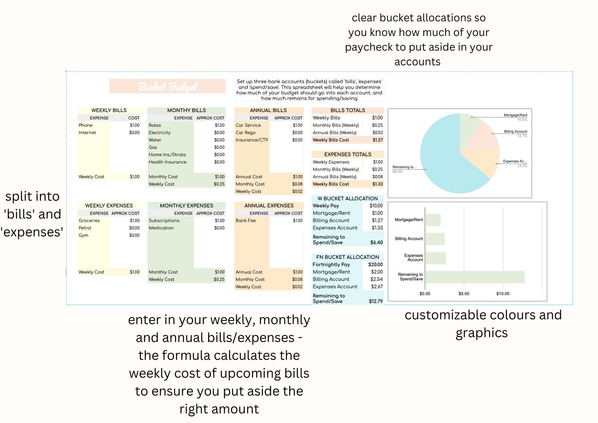 π Simple Customisation: With our template, you can easily input your weekly, monthly (28 day month), and annual bills and expenses. The cleverly set-up formulas automatically calculate the ideal amounts to allocate to each bucket/account, tailored to your unique financial situation. Budgeting has never been this fun!