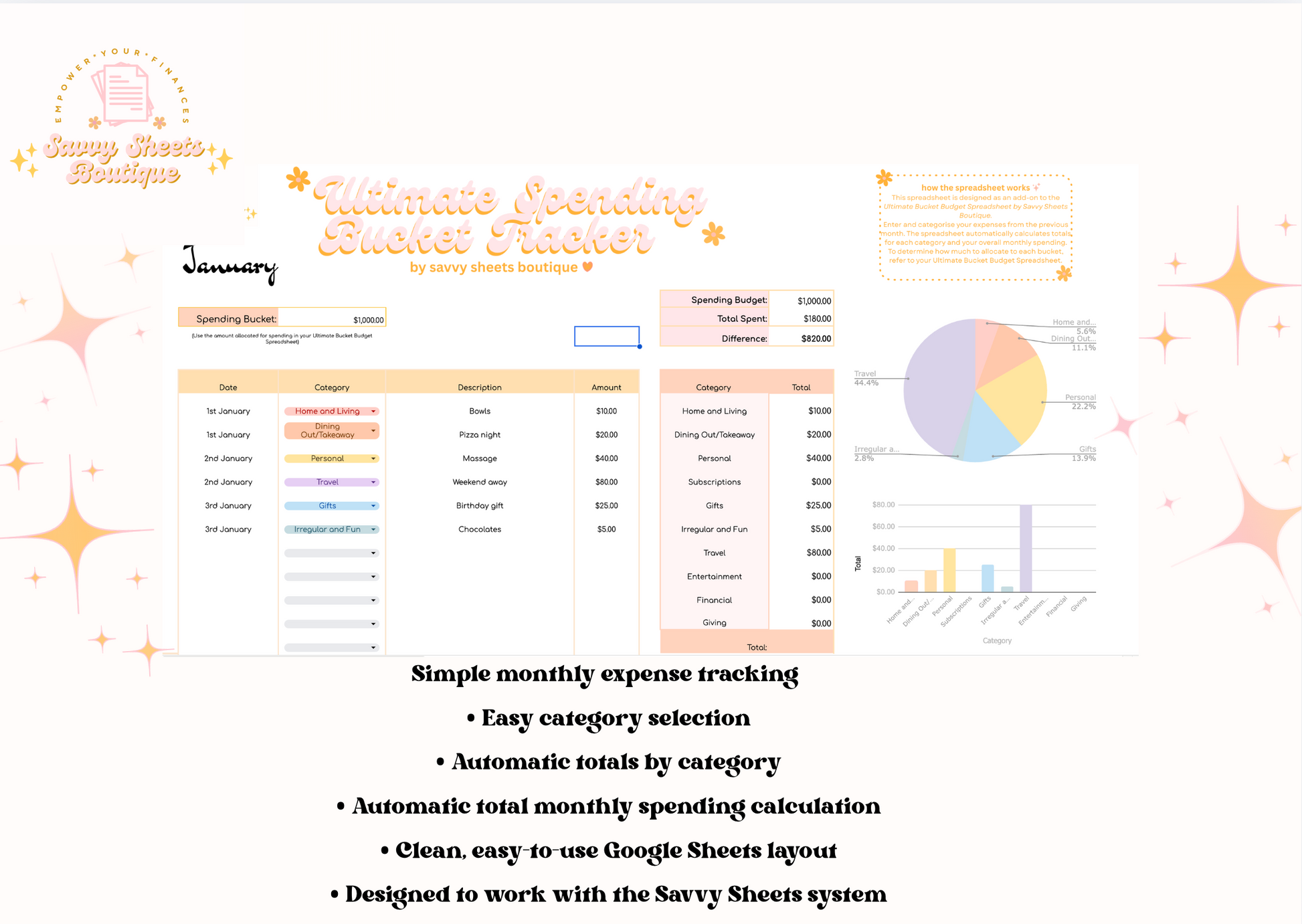 💖 Simple Monthly Expense Tracking: Enter and categorise your spending. The spreadsheet automatically calculates totals for each category and your total Spending Bucket for the month.