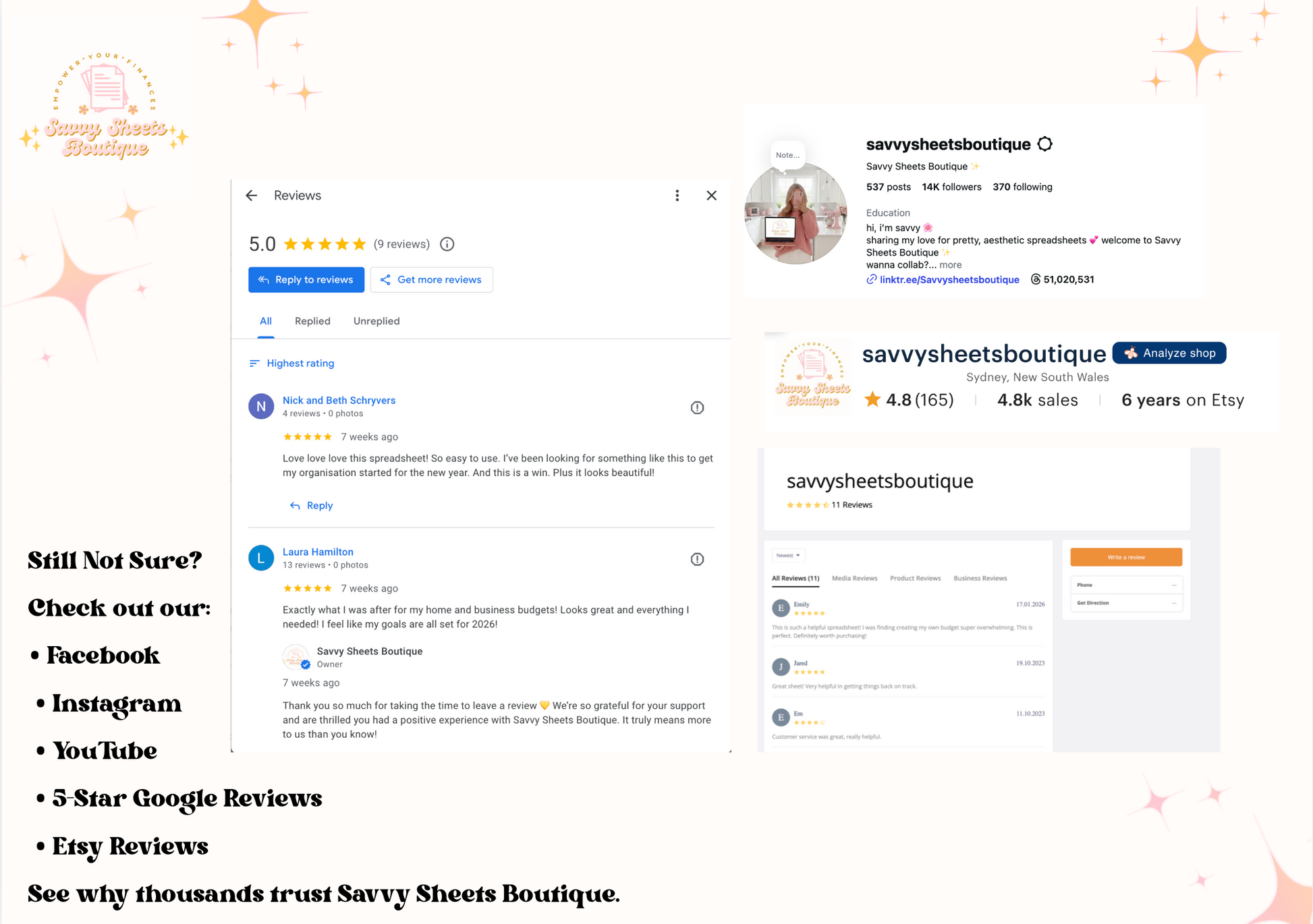 💡 Important Disclaimer: This budgeting Google Sheet template ("Template") is provided for informational and organisational purposes only. It is intended for personal use only and should not be considered a substitute for professional financial, legal, or accounting advice. Savvy Sheets Boutique is not a financial advisor, and we do not provide financial advice.